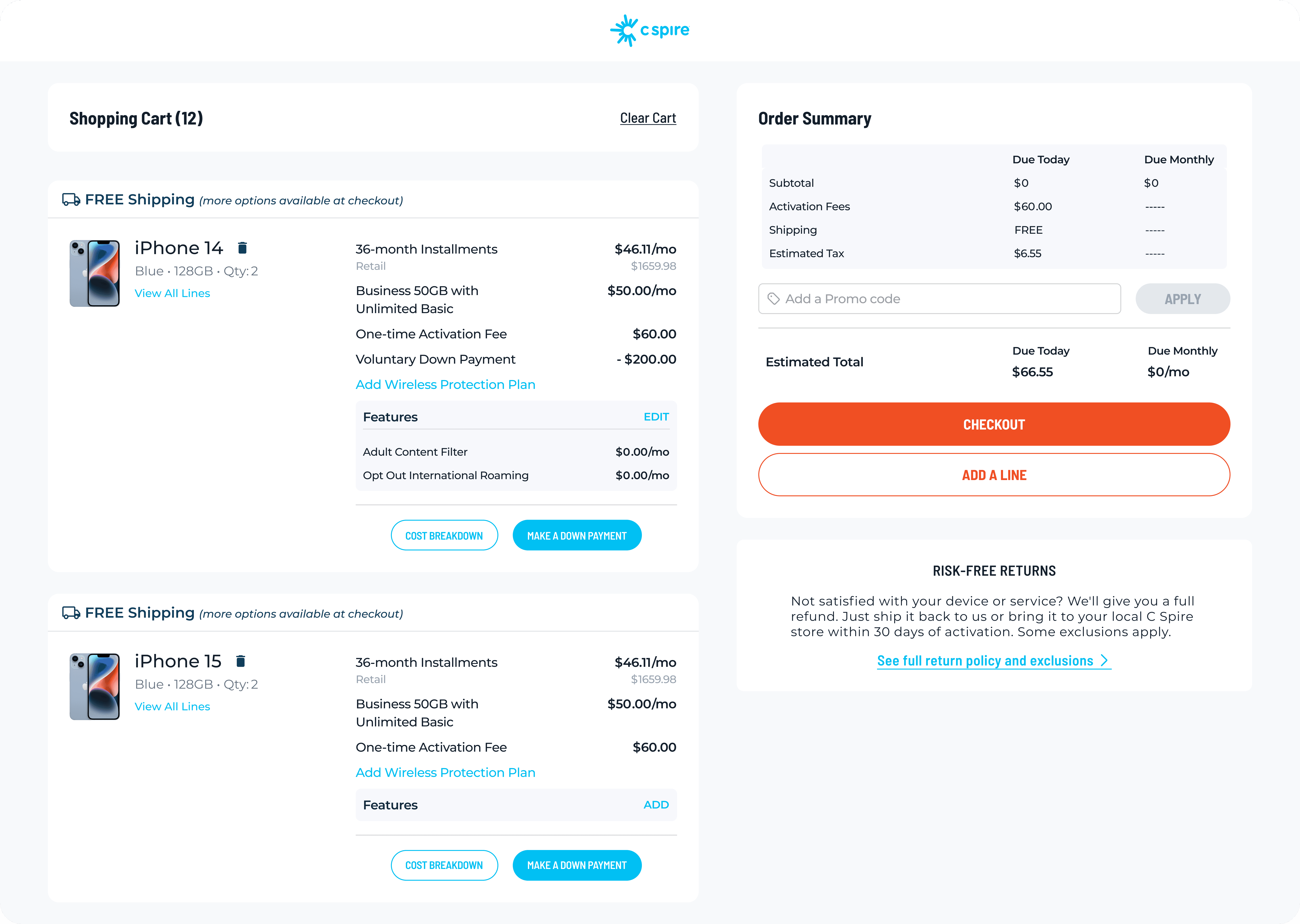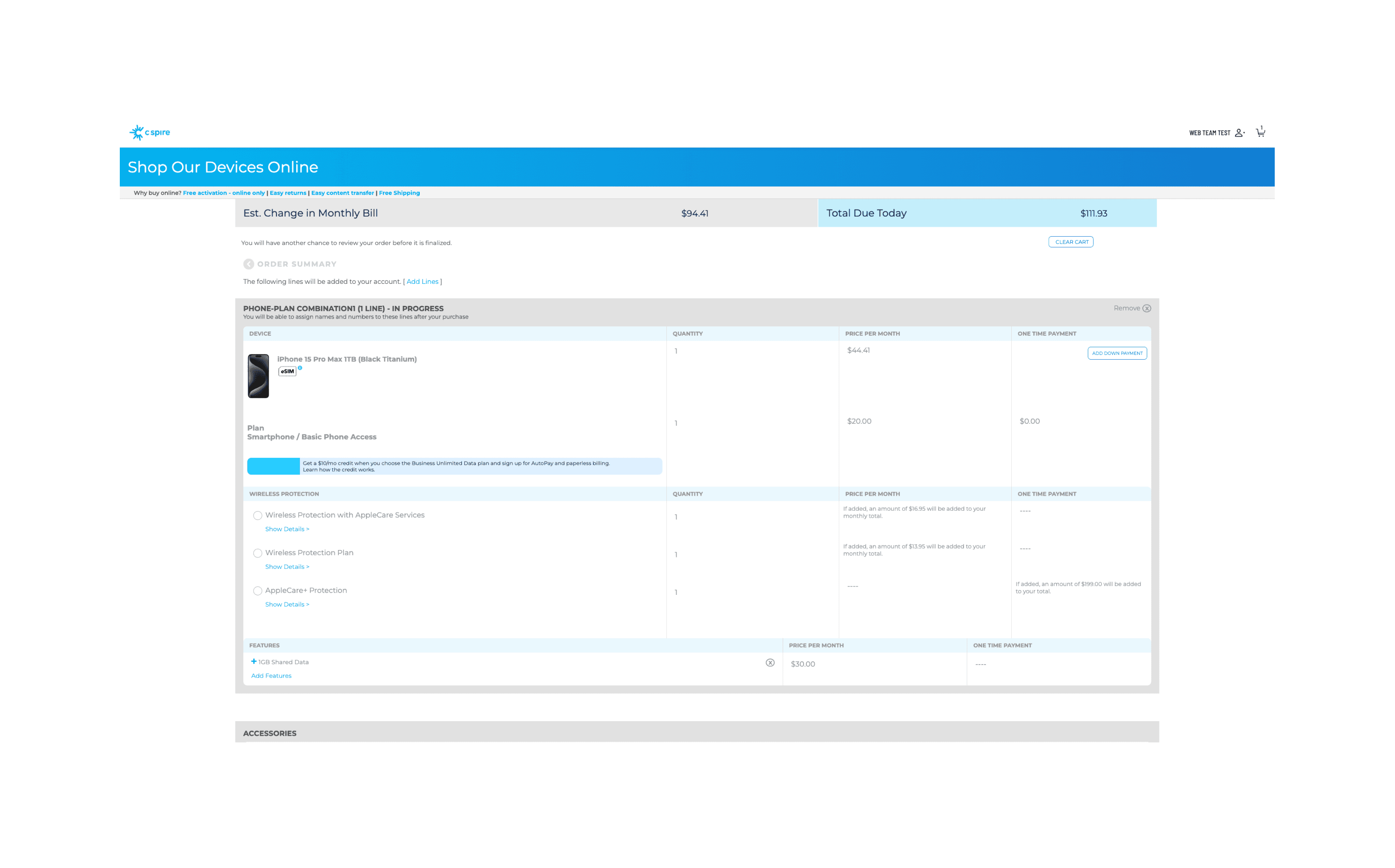 The shopping cart was streamlined to support multi-line visibility and bulk device management, empowering business users to review, edit, and proceed with large orders more confidently.