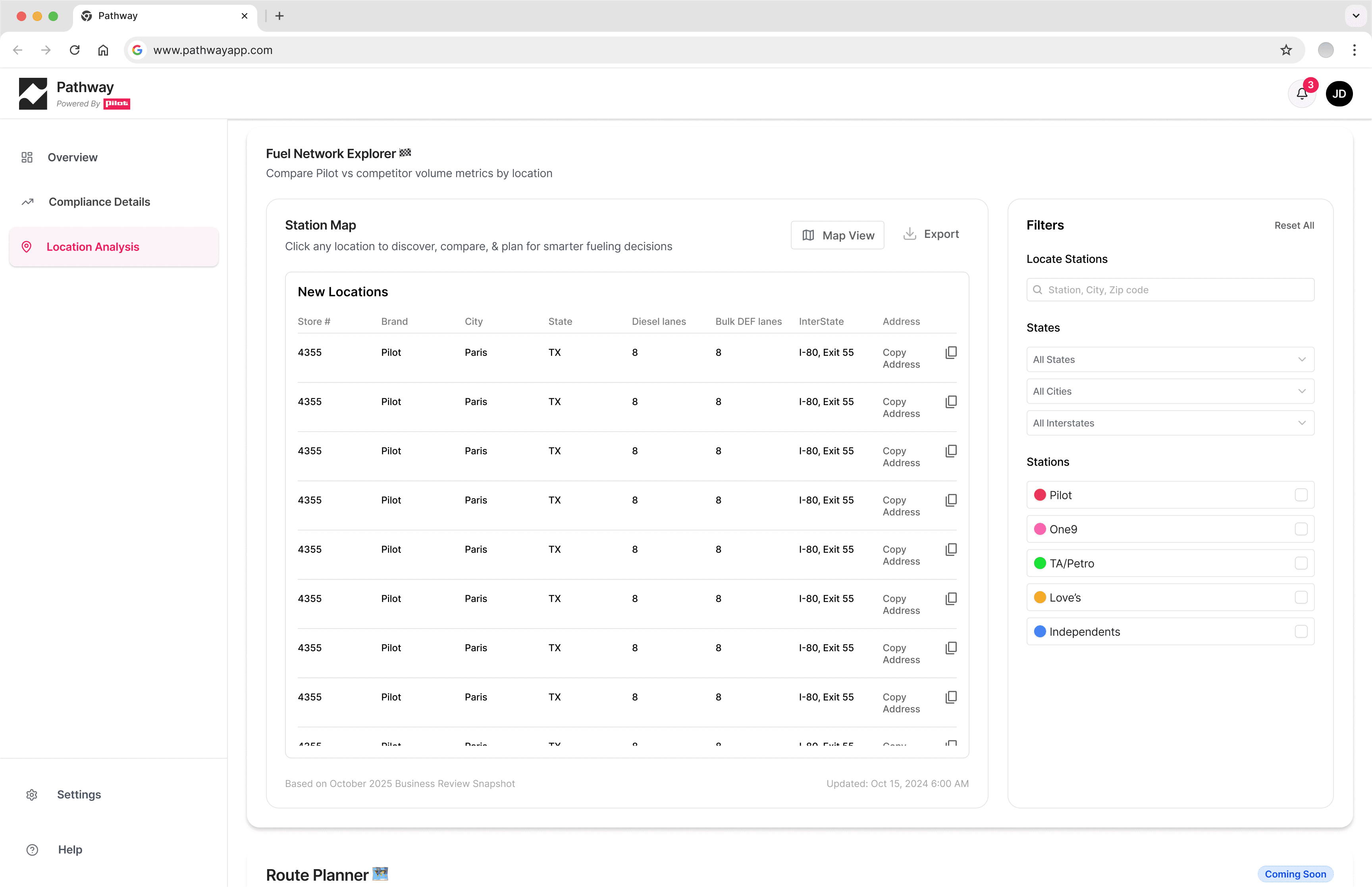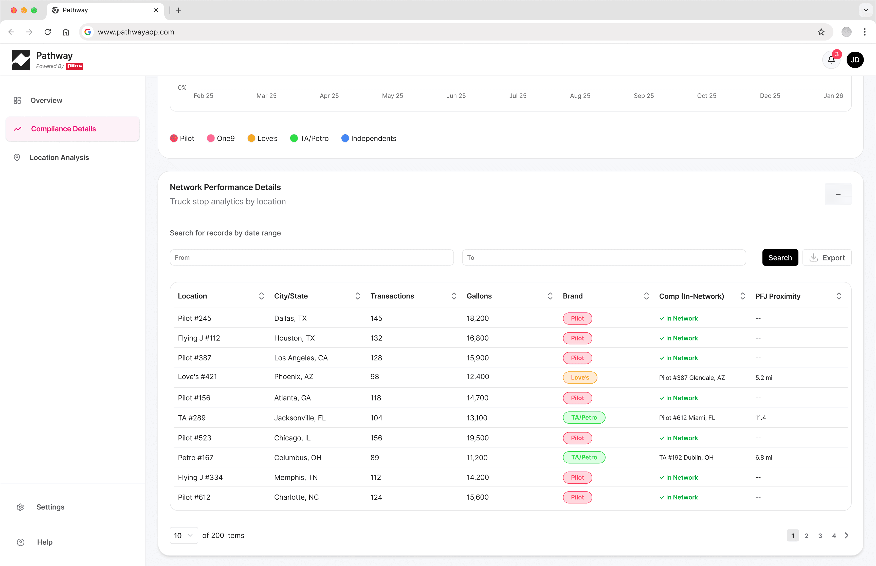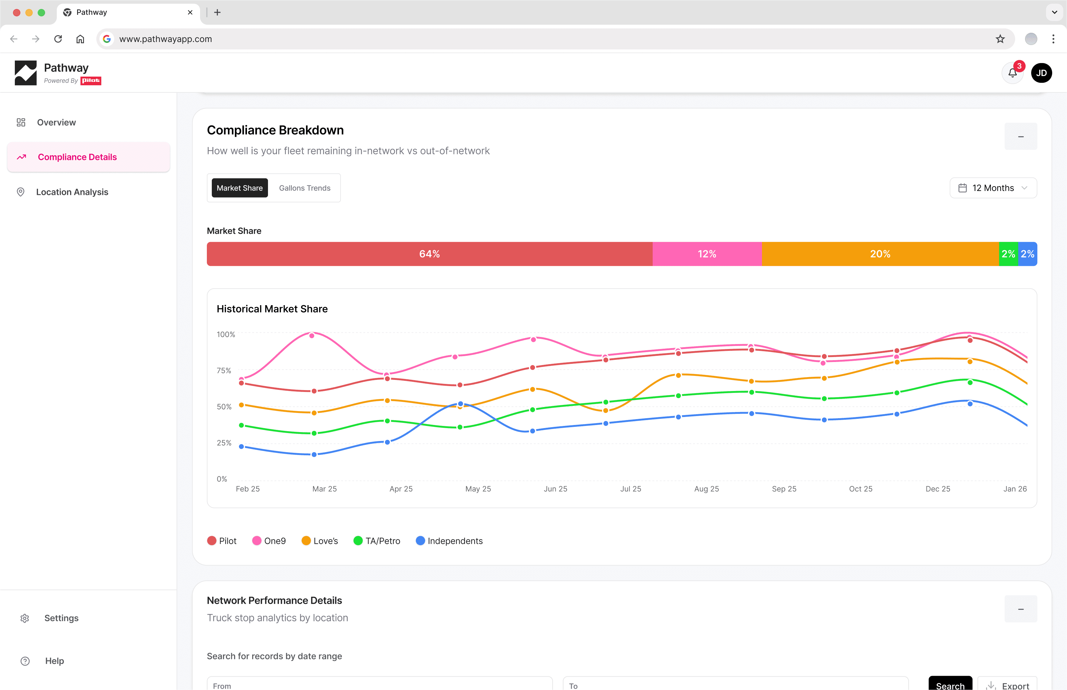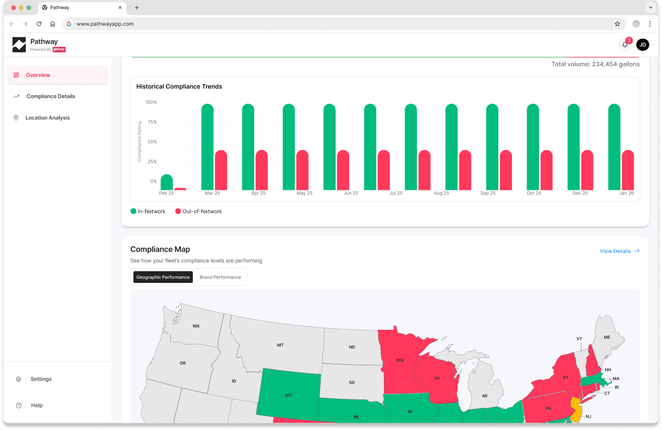 DataBricks data quality was insufficient to support accurate dollar-based savings calculations, so all financial framing was replaced with volume metrics: in-network gallons, out-of-network gallons, missed opportunity volume, and compliance rate as a percentage of total stops. A direct tradeoff between business aspiration and data integrity.