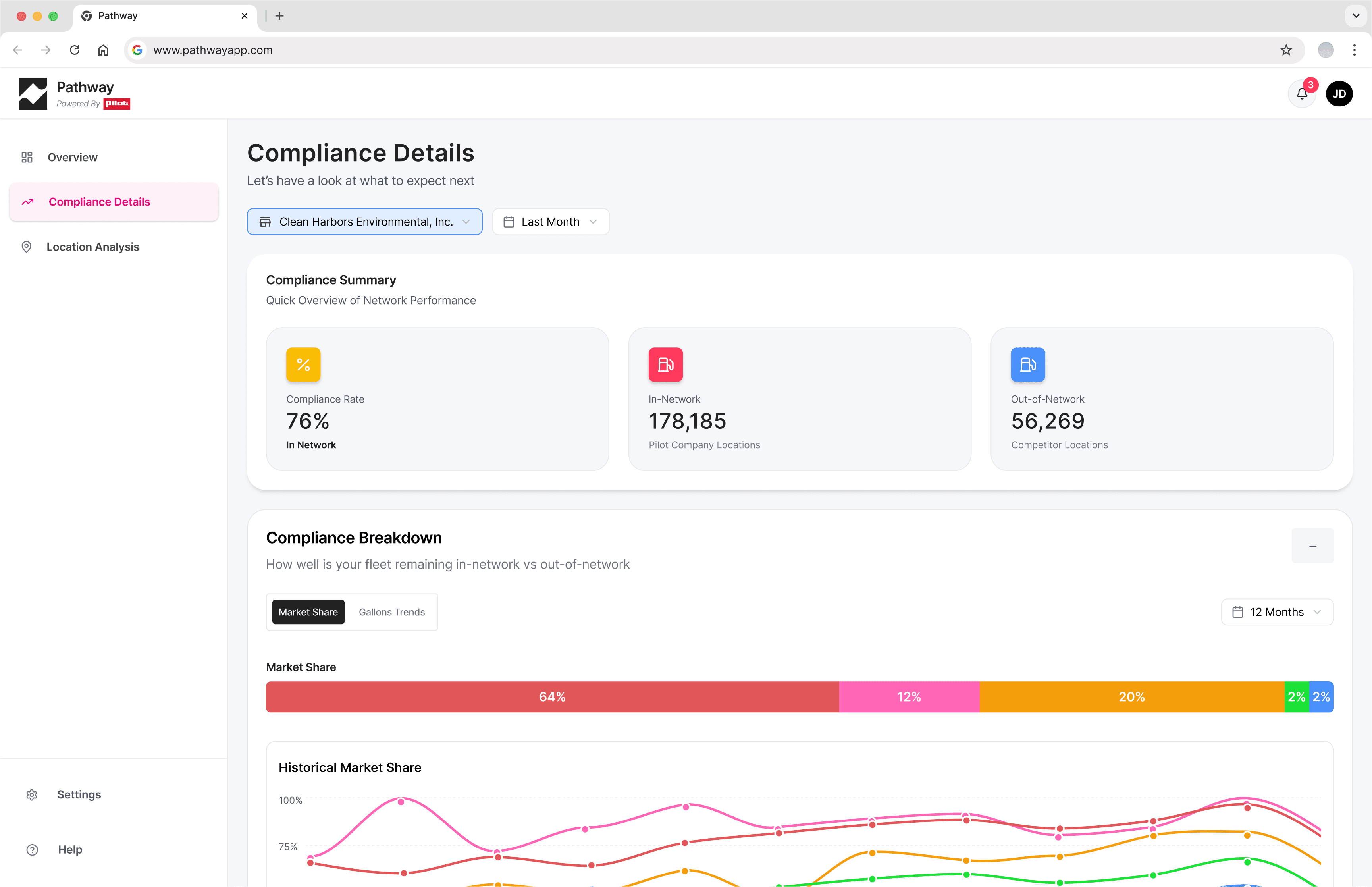 Navigation sidebar (Overview / Compliance Details / Location Analysis) establishes the three-screen structure explicitly — no fourth tab placeholder that would suggest the Savings Breakdown page exists.