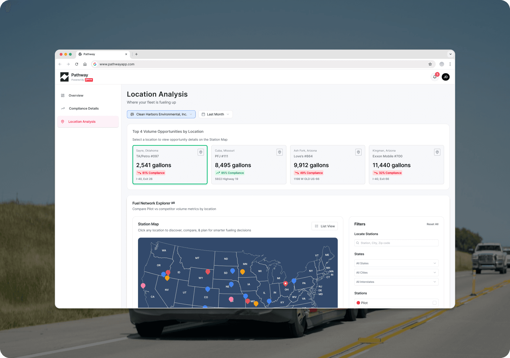 Top 4 non-compliant locations surfaced with gallon volume and competitor stop name — actionable, location-specific, no dollar estimate required.