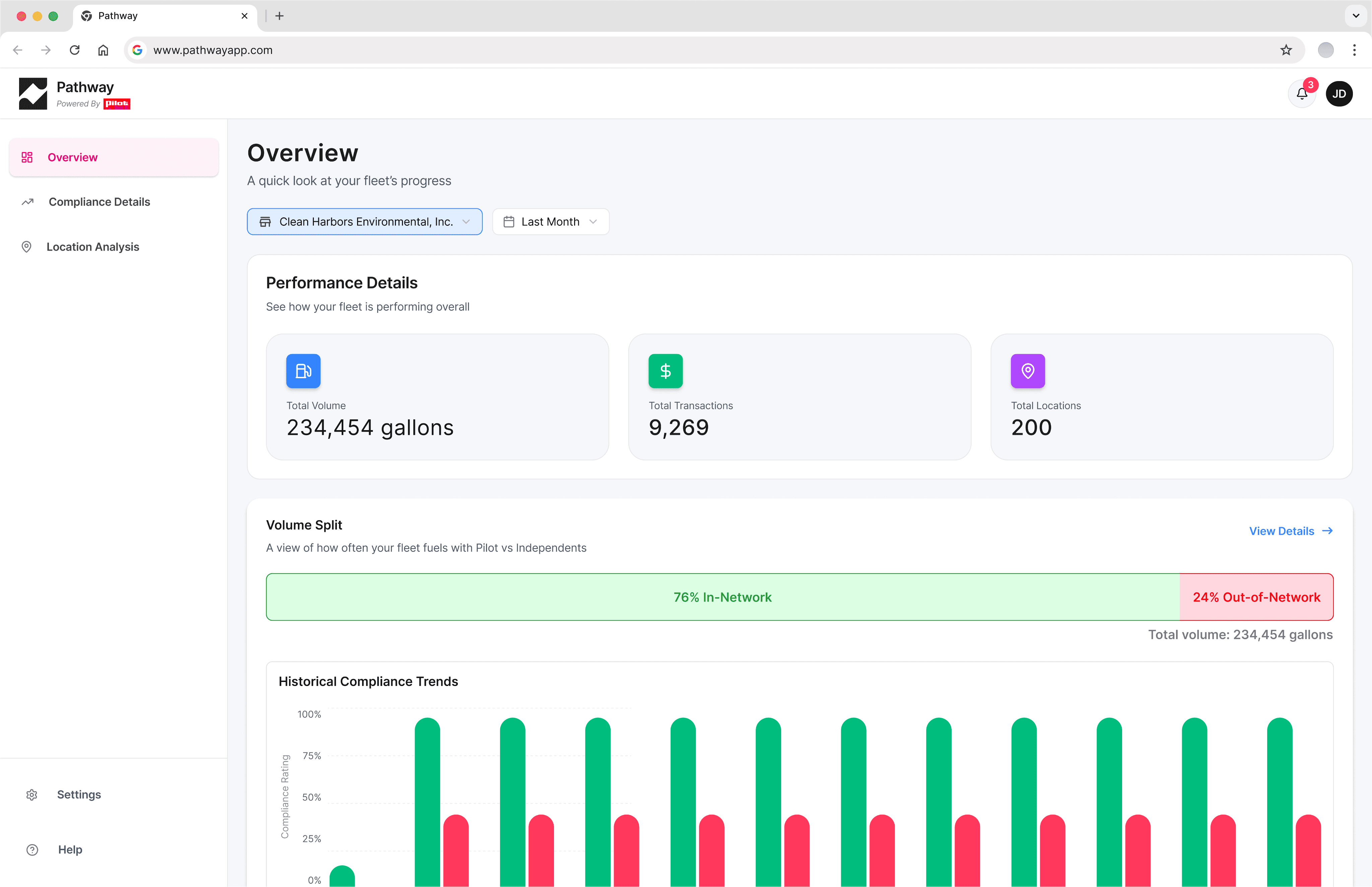 Network Rate (76%), Total Stops, In-Network gallons (7,044), Out-of-Network gallons (2,225) as the four primary KPIs — all volume-based.
