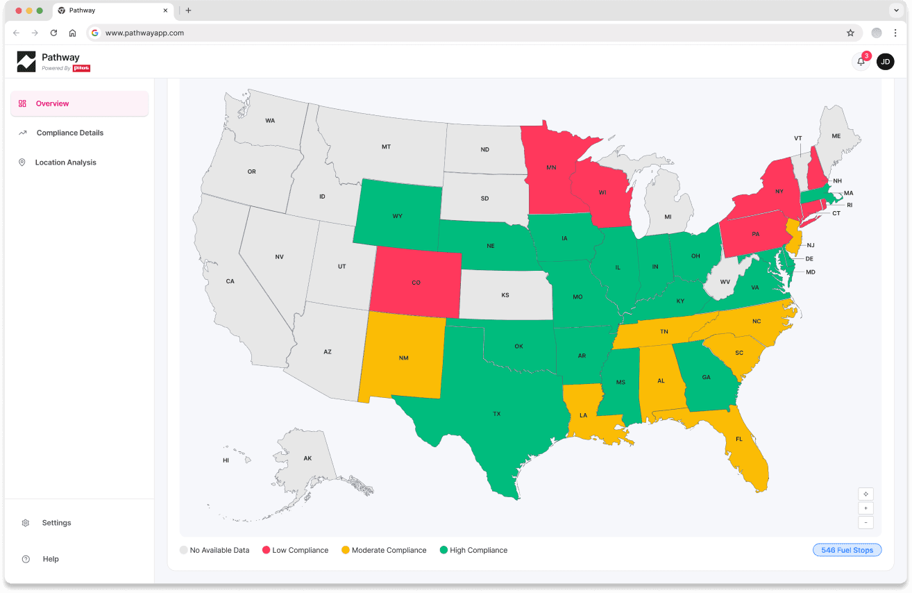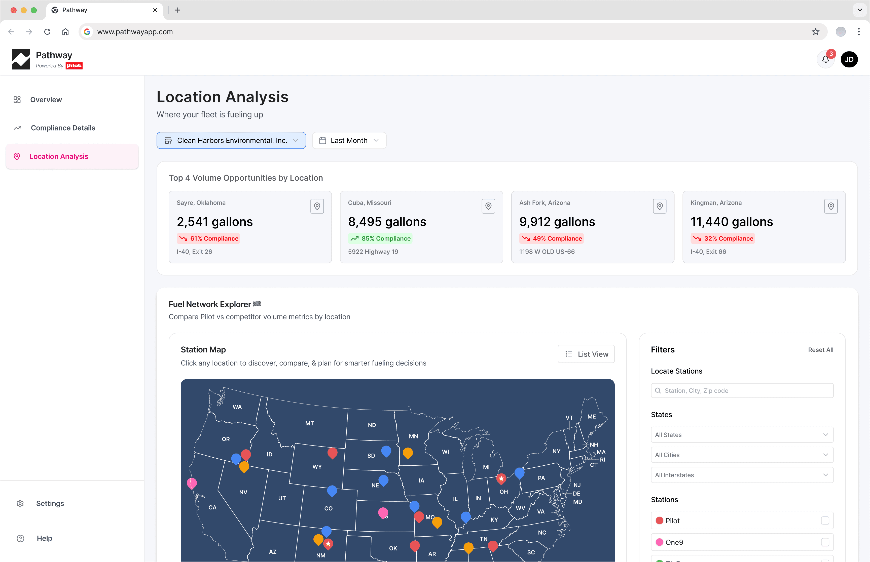 US heat map shows geographic concentration of off-network fueling — gives fleet managers and sales reps a spatial understanding of compliance gaps.
