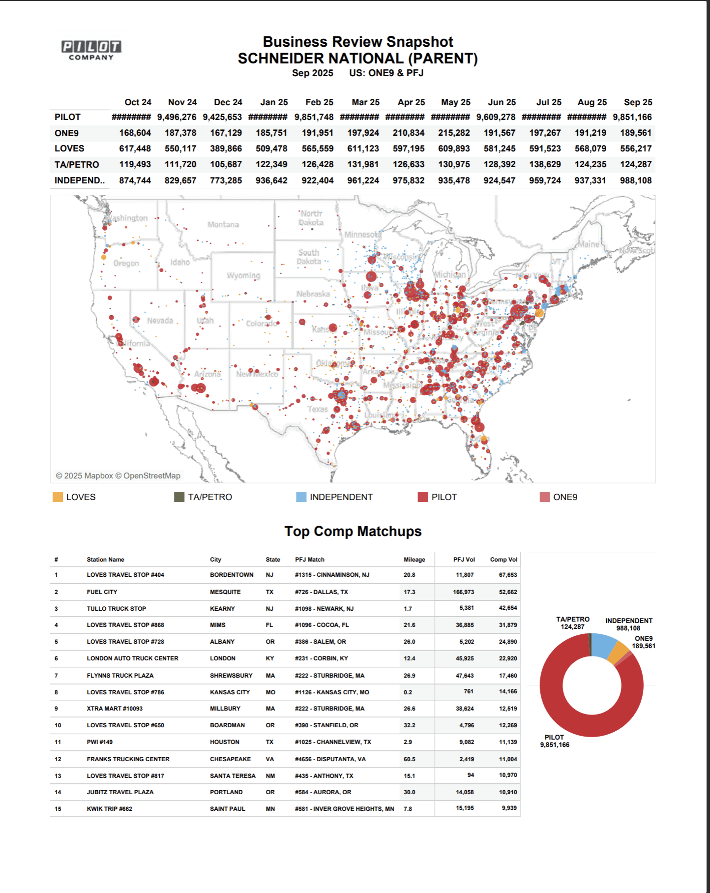 Bar chart: Top 25 new off-network locations ranked by volume, filterable by brand (One9, Love's, TA/Petro, Independent).