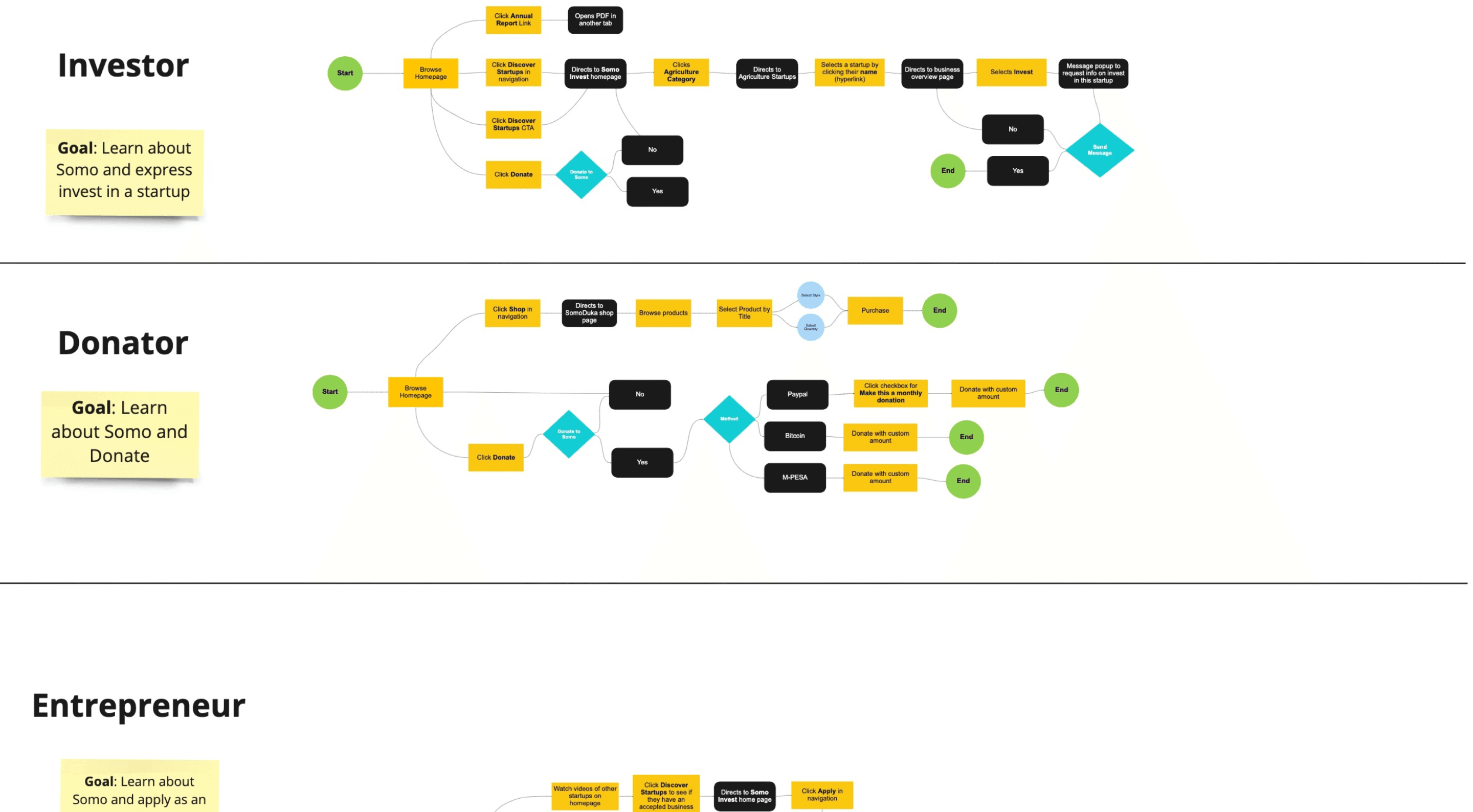 The Research Phase was dedicated to understanding the unique needs and behaviors of each stakeholder group through interviews, usability tests, and competitive analysis. This stage helped us gather insights into what drives each group, their primary challenges, and how Somo’s services could better meet their needs.